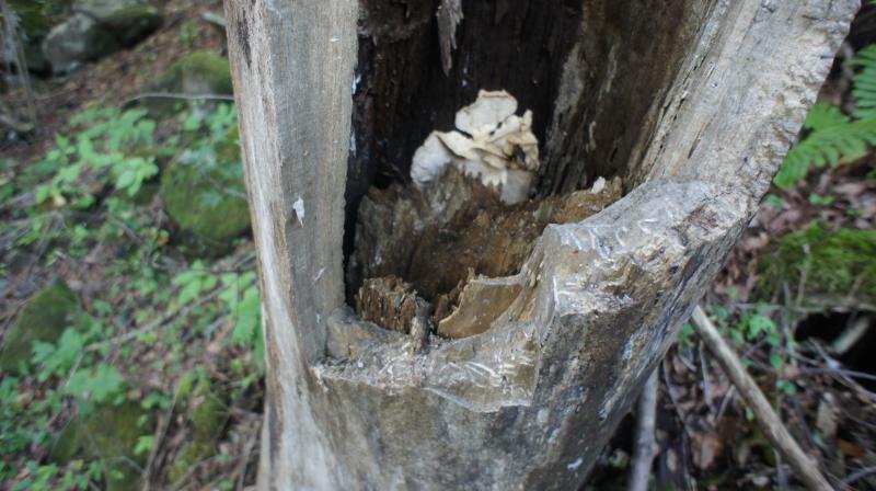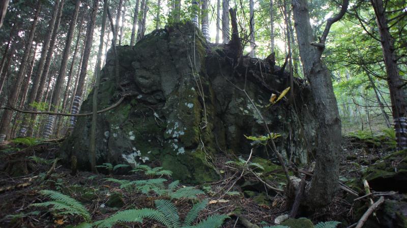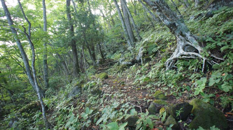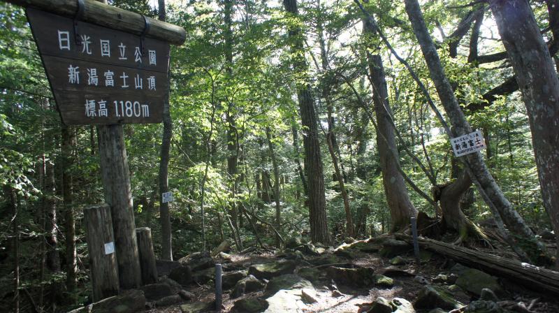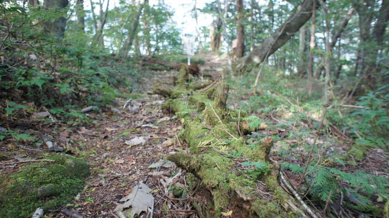 - 新湯富士は樹林帯が山頂まで続く山で、岩にもびっしり苔がついており