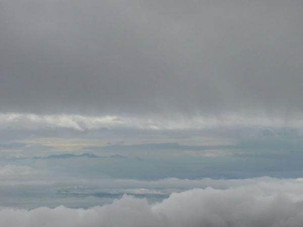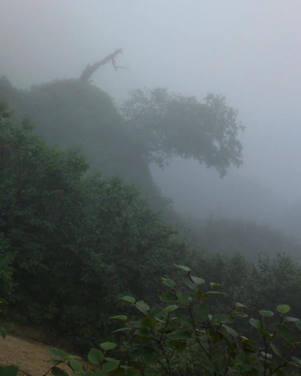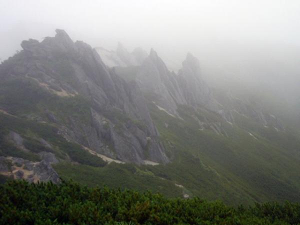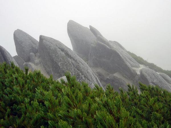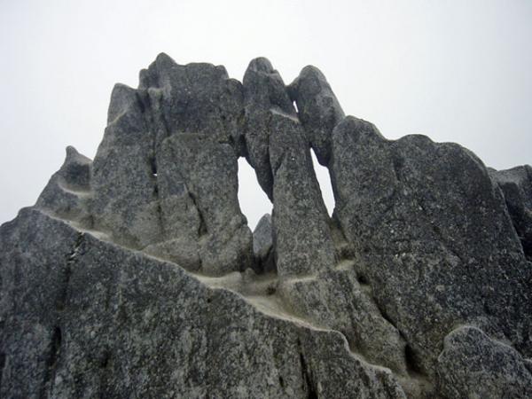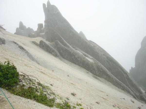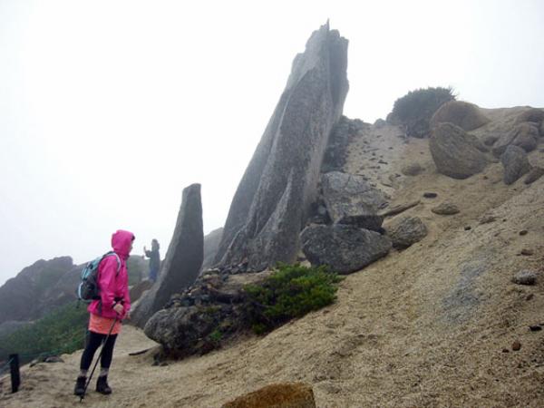 雨と霧で視界はほぼゼロの中、山頂の奇岩のオブジェが唯一の慰めでした。