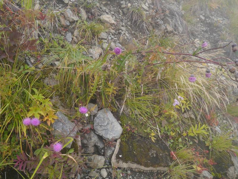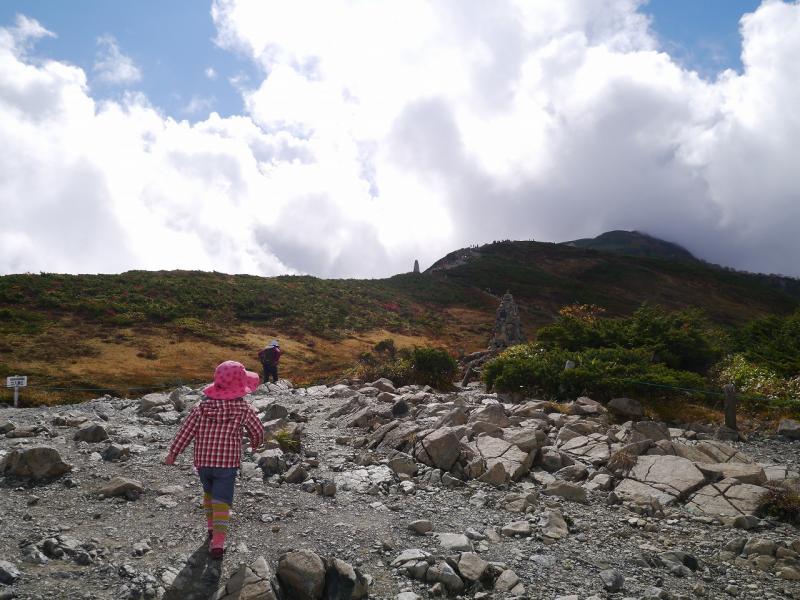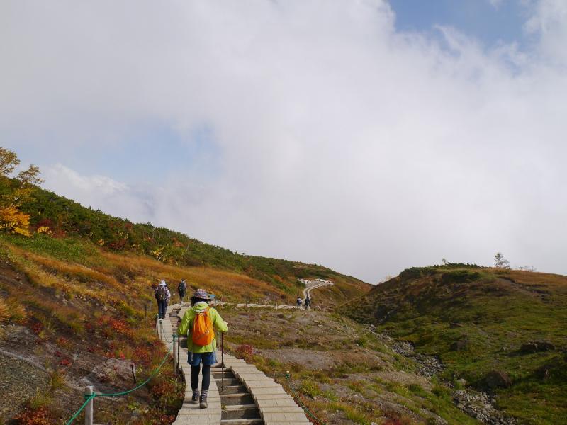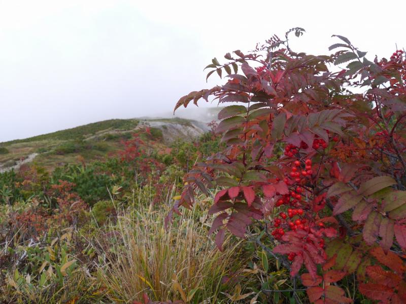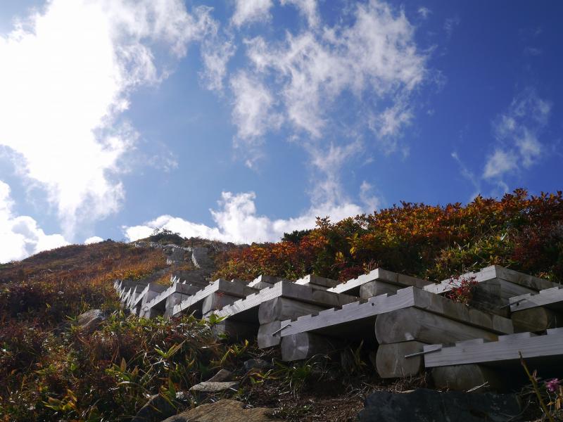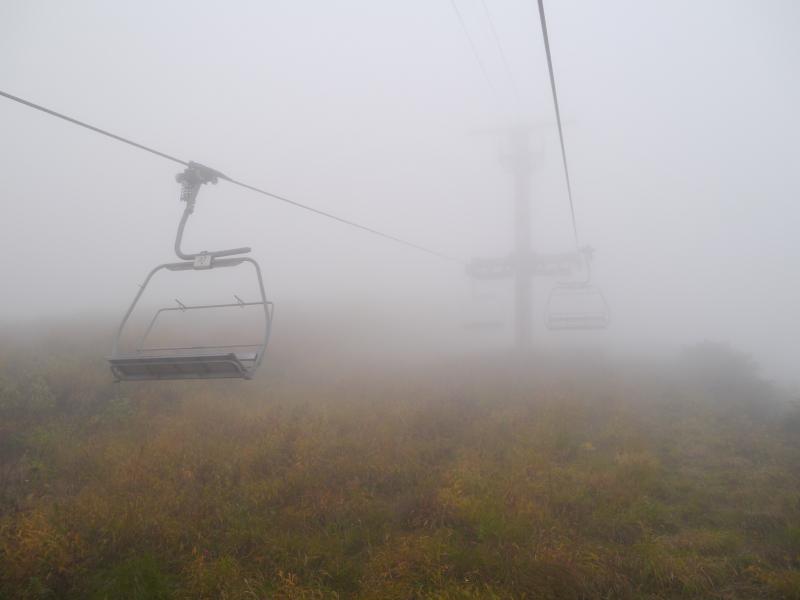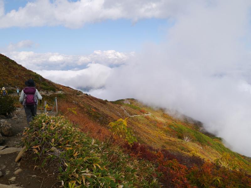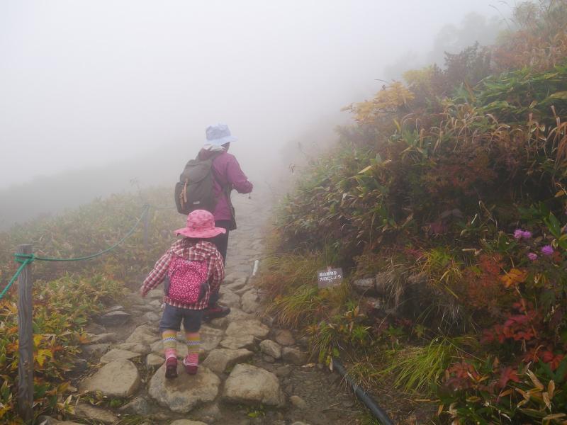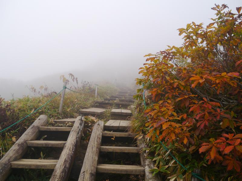 麓からと、登り始めてしばらくはガスガスで霧雨状態でしたが、稜線手前から少し晴れ間が。