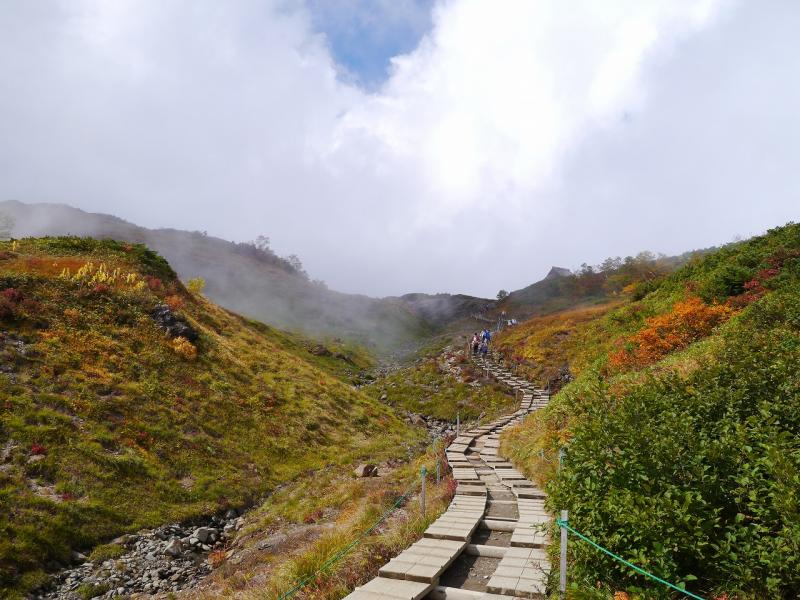 - 霧雨のため、八方池山荘からしばらく続く石の道はツルツルだったりぬかるんでいたり、水たまりができていたりと、登山靴でもなかなか登りづらい道になっていました。