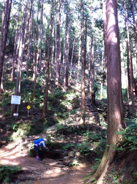 進むとすぐ沢の音と一緒に、ひしゃくのついた水場が出ます