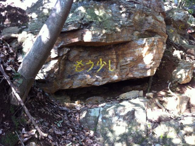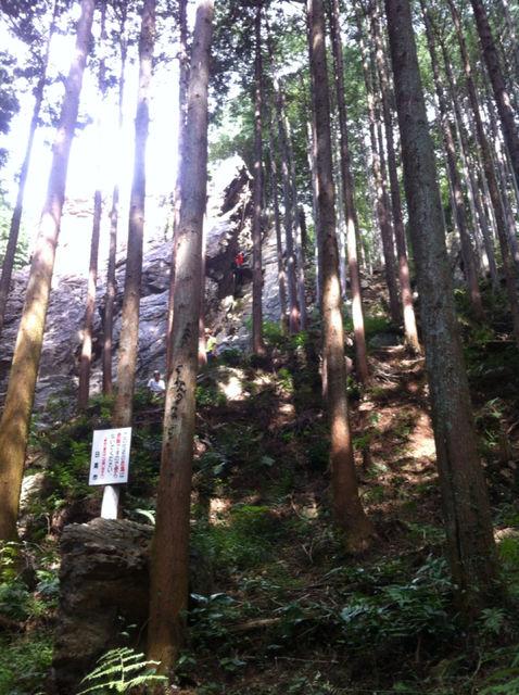 その岩にあーだこーだ言いながら登るとすぐに、鳥居が見えます