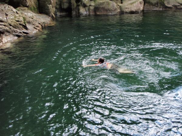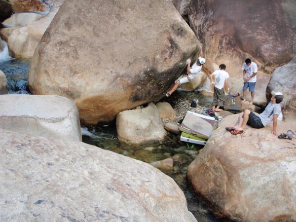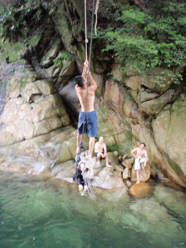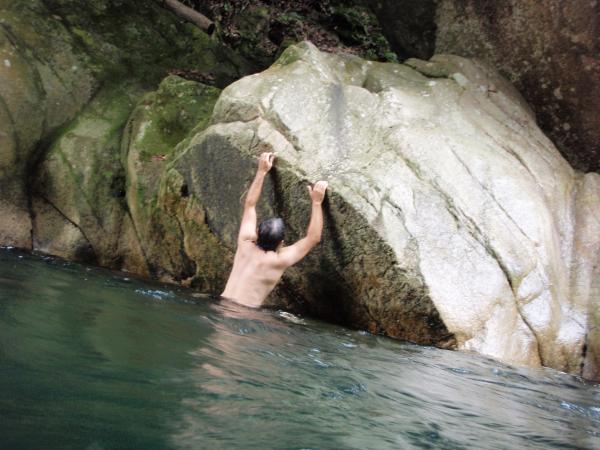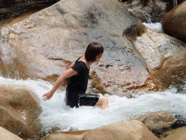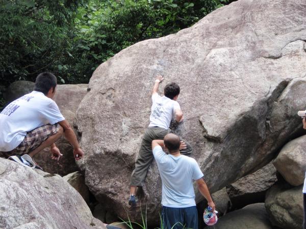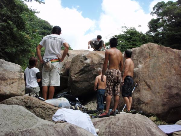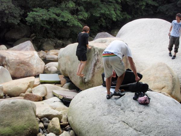 外岩に歯がたたない事を早々に悟り、木にくくられたロープから淵に飛び込んだり、泳いだり、小さなナメに座ってのんびりクライマーを眺めたり、岩登りと水遊びを堪能しました。
