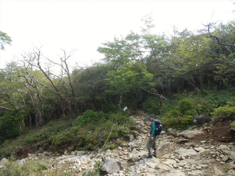 涸沢分岐点経由の道は急な山腹を進む箇所あり。