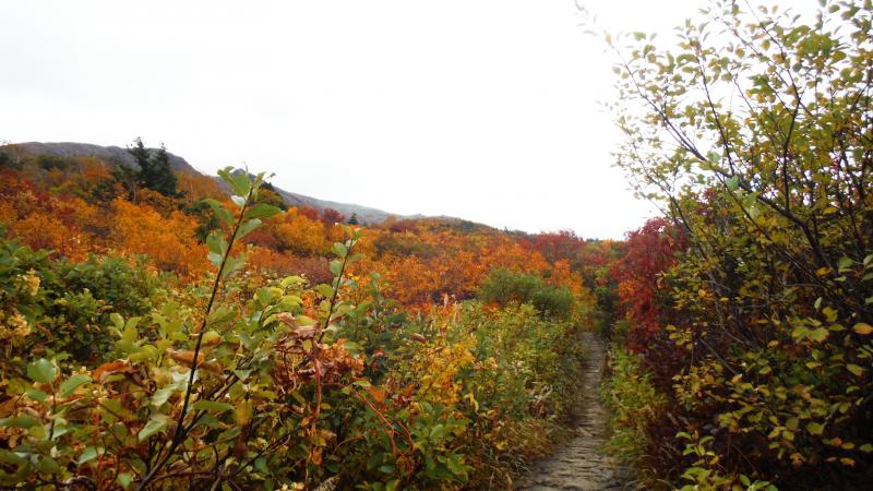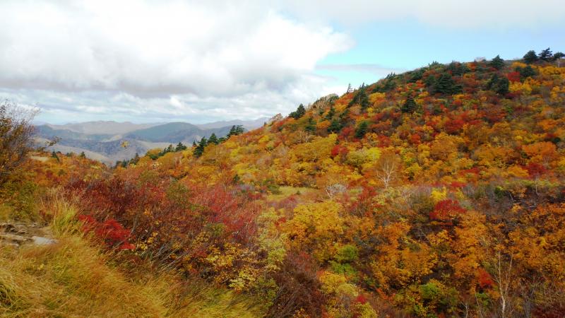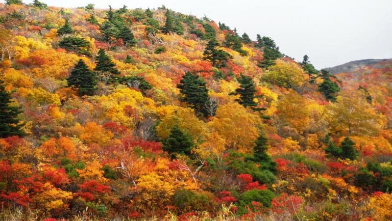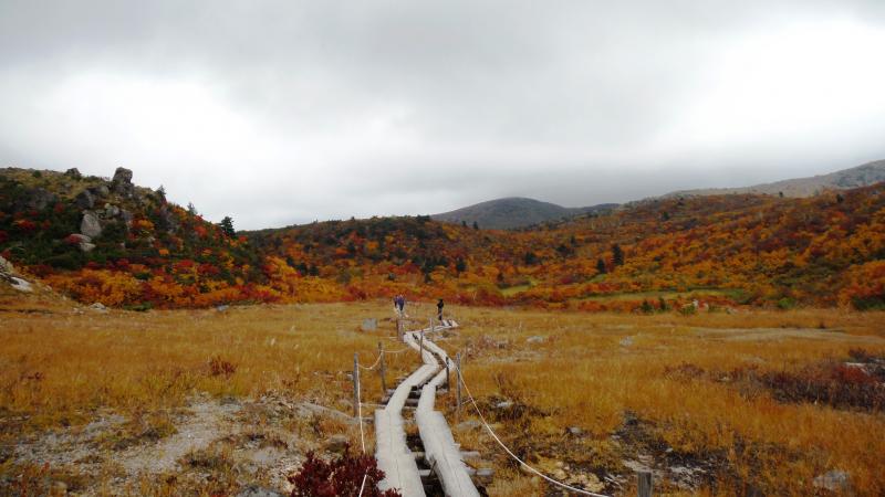天気も微妙な曇り。肝心の紅葉ですが山頂は盛りを過ぎていましたが、それでもなだらかな山辺り一帯に色とりどりの草木が見事で、オレンジや黄色、赤など絵の具をぽたぽた上から落としたような色彩。多くの人が訪れるわけですね。