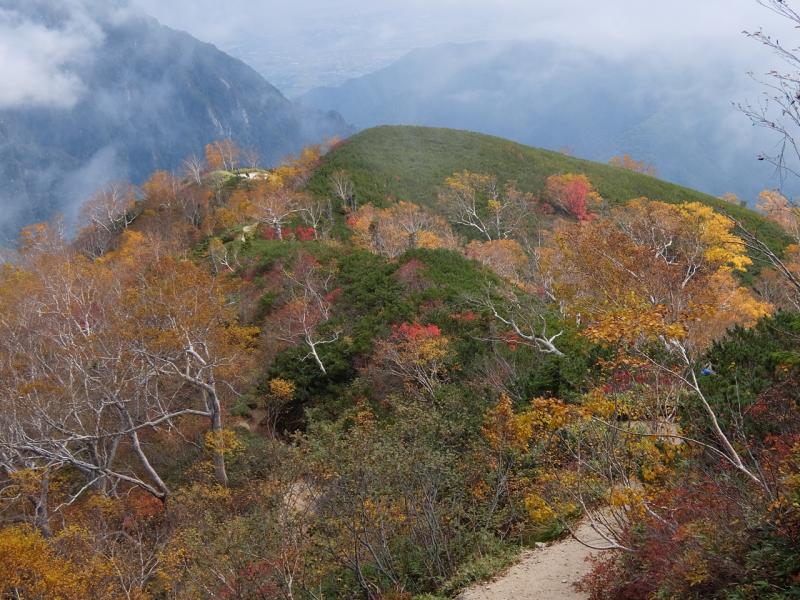崩落が進む滑りやすい土の急斜面や、急な登り返し、仮設の吊り橋などがありますが全体的には緩やかな斜面が続きます。
