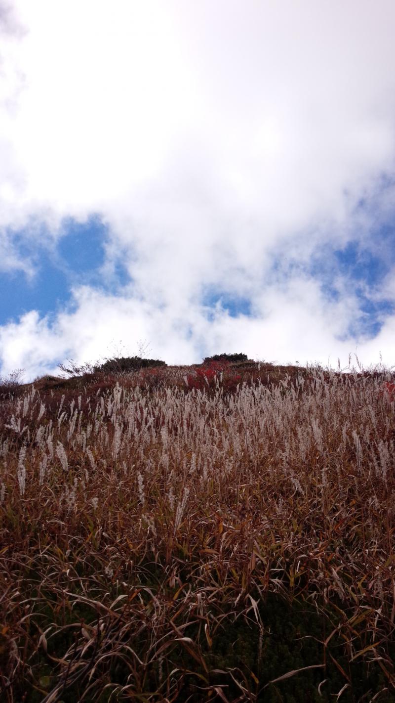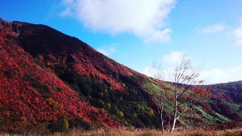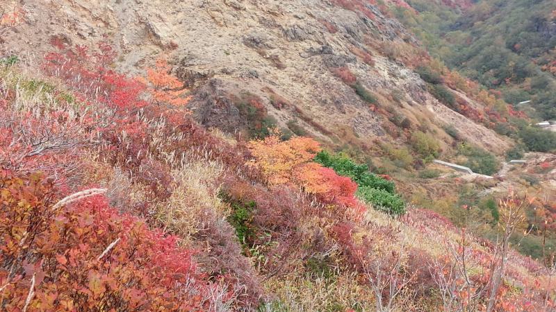 紅葉の状況は、ちょうど見頃で避難小屋まで行く途中の右側の広い山肌が紅く染まっており大変綺麗でした。