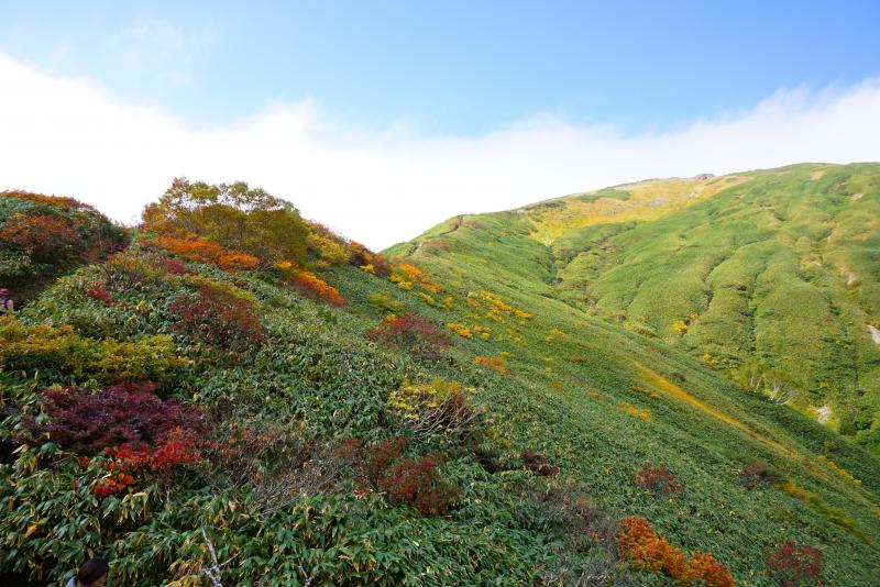 段々とブナ林がなくなり急勾配のササ原の中を黙々と歩きます。