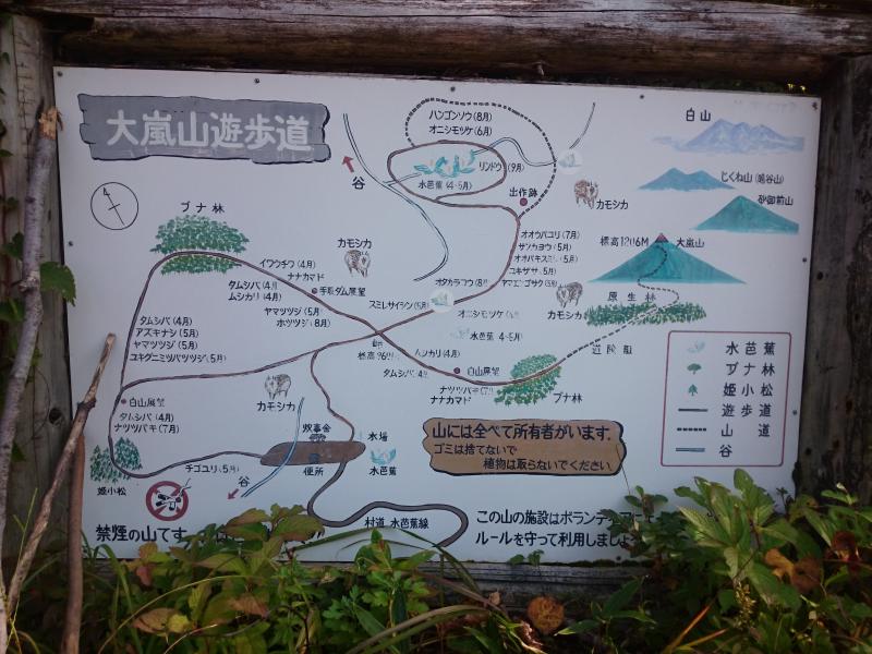 - 登山口駐車場(10)分岐(40)大嵐山(25)分岐(展望コース30)登山口駐車場