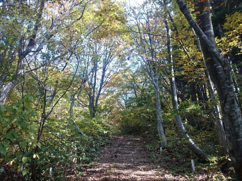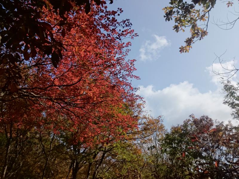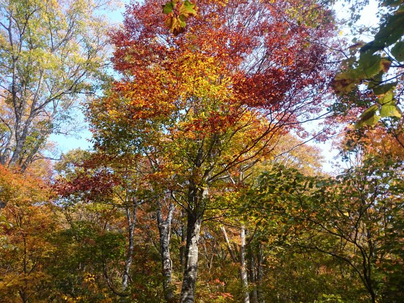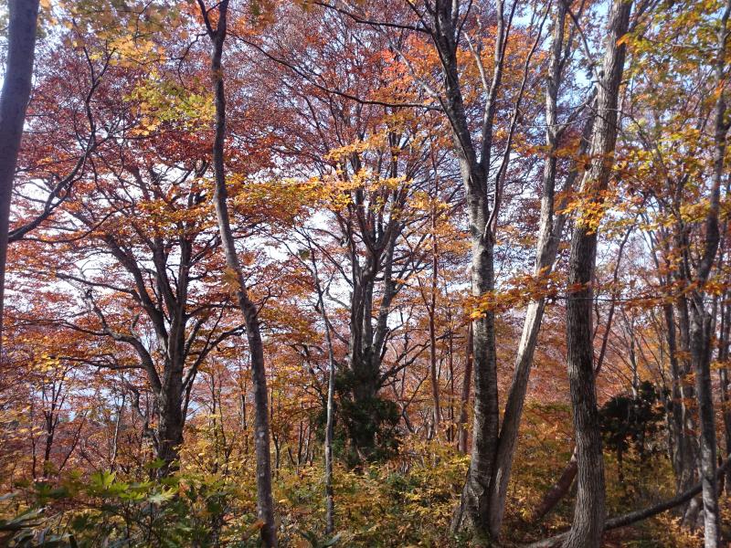 紅葉もだいぶ降りてきたので、どこかいい山ないかな~と探していてふと思い出したのがこの大嵐山。水芭蕉で有名な里山ですが、素晴らしいブナ林の登山道となっています。新緑の時期に歩いたことはありますが、秋に来るのは初めて。紅葉の具合はどうかなと期待して向かうと、、、バッチリ!期待通りきれいな紅葉を眺めつつまったりハイキングできました^^b
