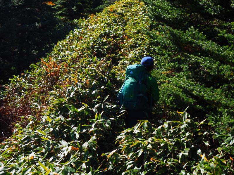 登り始めから急傾斜と倒木が多く頭上、足元に注意を払いながら進みます、笹薮を延々進みますのでタイツ+短パン的なスタイルは間違いなく後悔しますので。パンツスタイルで行くことをお勧めします。