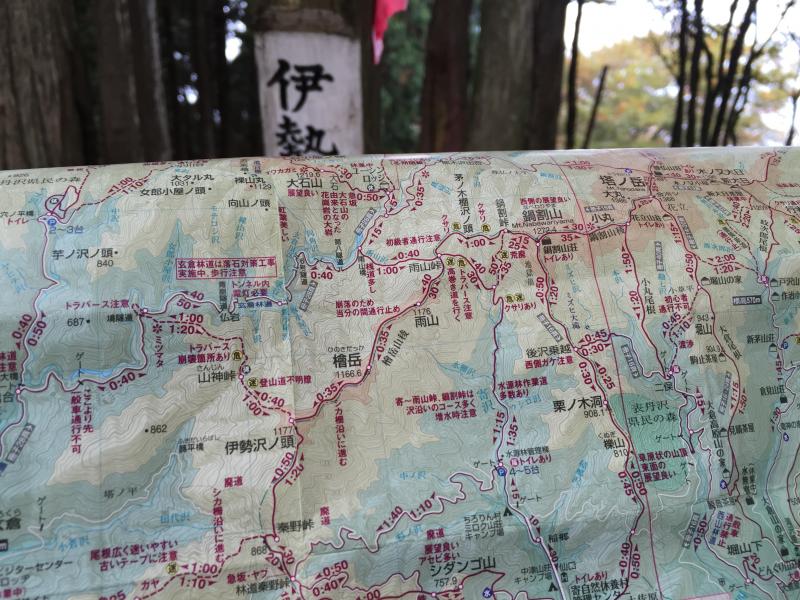 - 高松山入バス停口⇒(80分)高松山⇒(30分)29号鉄塔⇒(20分)分岐⇒(15分)林道秦野峠⇒(25分)秦野峠⇒(40分)伊勢沢ノ頭⇒(15分)檜岳⇒(25分)雨山⇒(10分)雨山峠⇒(35分)鍋割峠⇒(20分)鍋割山⇒(15分)小丸⇒(30分)塔ノ岳⇒(20分)新大日⇒(60分)三ノ塔⇒(55分)ヤビツ峠⇒(35分)蓑毛バス停
