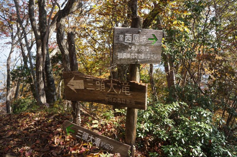 - 都民の森(20分)鞘口峠(60)三頭山中央峰(15)避難小屋(80)西原峠(60)仲の平バス停
