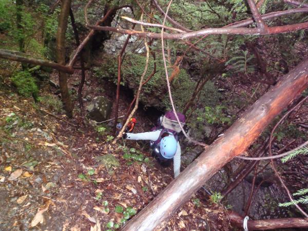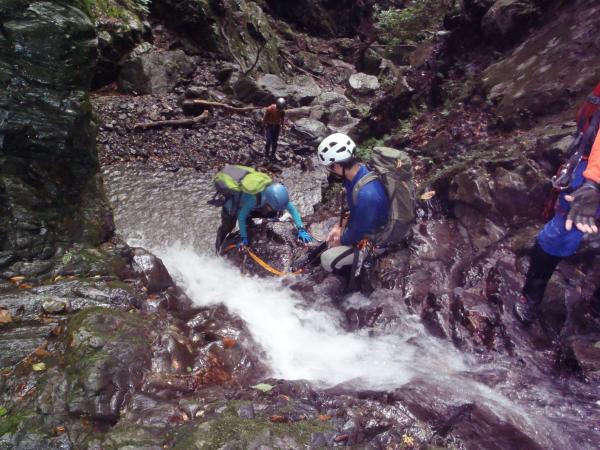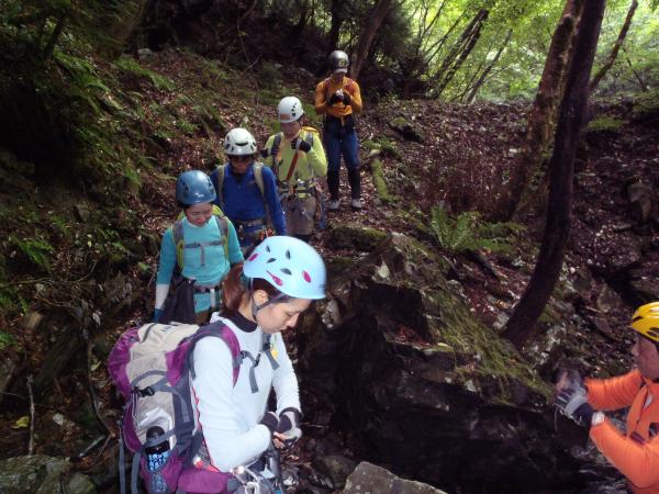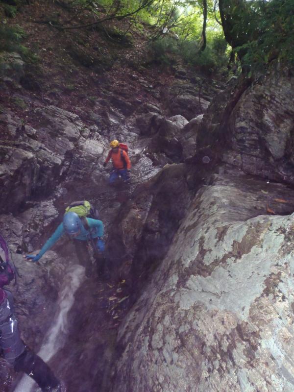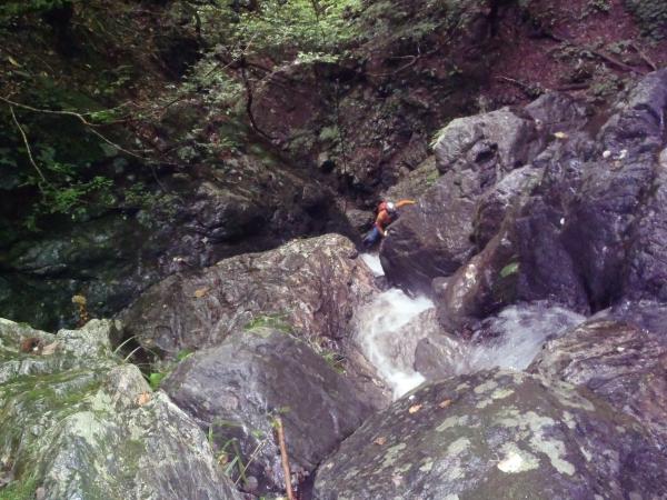 台風が近づいており早朝には大雨が降っていましたが、現地に着くと晴れていました。途中パラパラと降っていましたが谷の中ということと既に全身が濡れているということで全く気にならなかったです。少し薄暗い谷ですが沢が初めての方と一緒に行くにはちょうどよい沢でした。