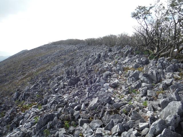 下ってすぐにガレた岩場の道となり踏み跡が判然としません。
