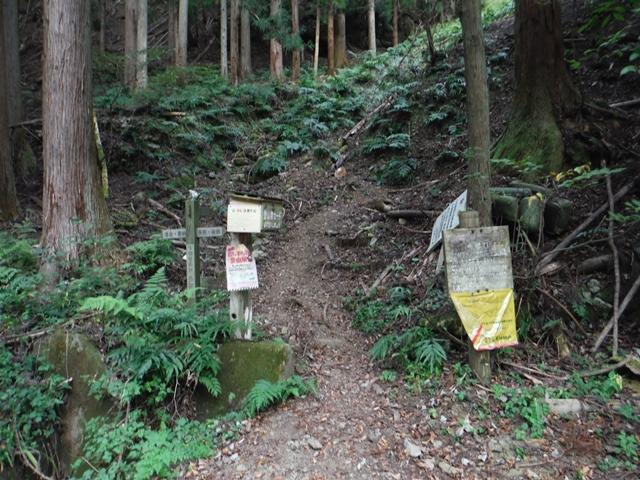 名阪高速をくぐり抜け、林道を進むと養鶏場があり左の砂利道を進んでいくと一合目の看板があります。