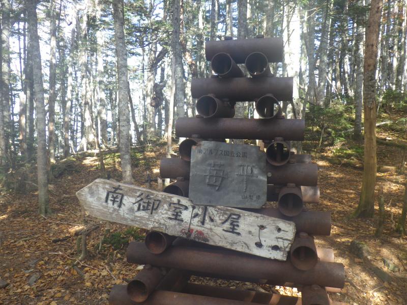 - 1日目:夜叉神登山口(60分)夜叉神峠(120分)杖立峠(120分)苺平(20分)辻山(15分)苺平(40分)南御室小屋