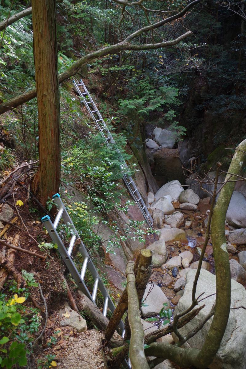 一部、御所谷下で、林業道との分岐に注意して右岸を歩きますが、丸太橋が老朽化していて、注意して渡ってください。
