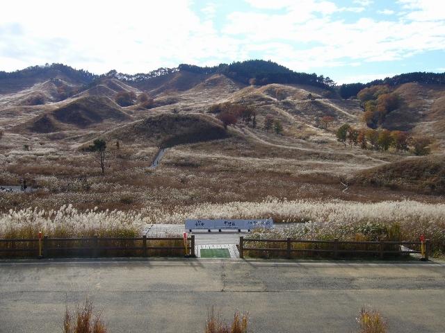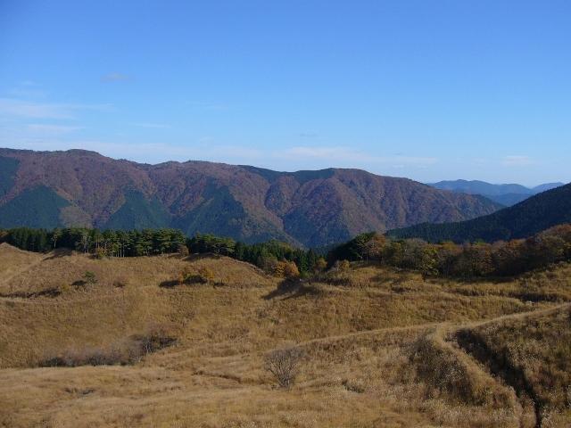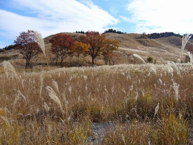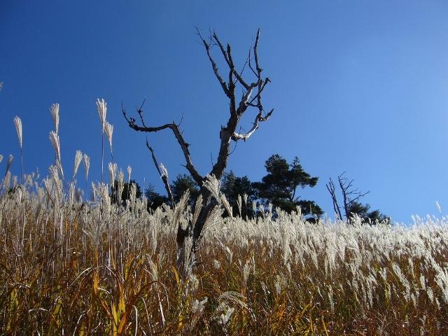 背丈を超えるほどのススキのイメージが強い砥峰高原、ススキの根元にまだ緑が残っており、