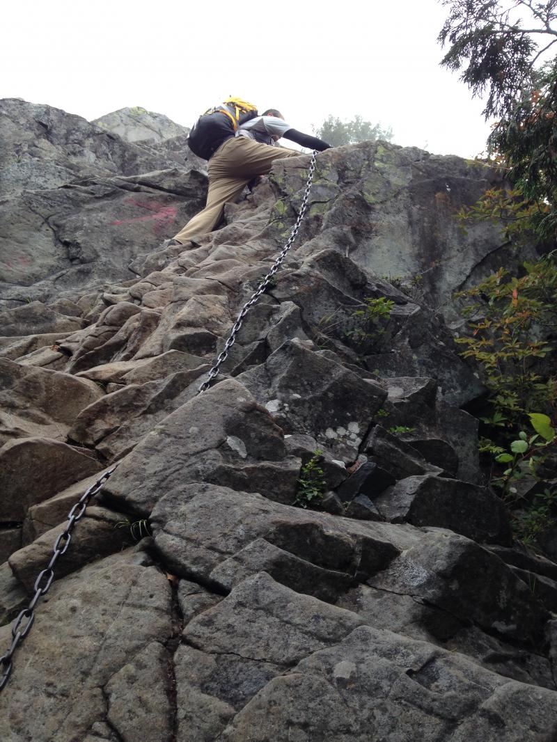 山頂直前の鳳岩(おおとりいわ)が長い鎖が取り付けられた、ツルツルの大岩。