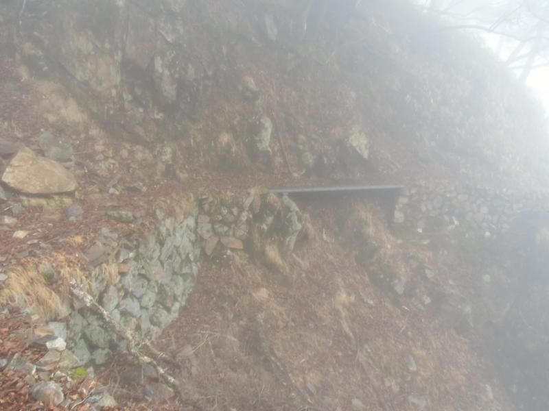 霧の為、路面濡れてました。大部分は土だが、たまに出でくる岩・木の根が滑る。古い木橋も滑る。