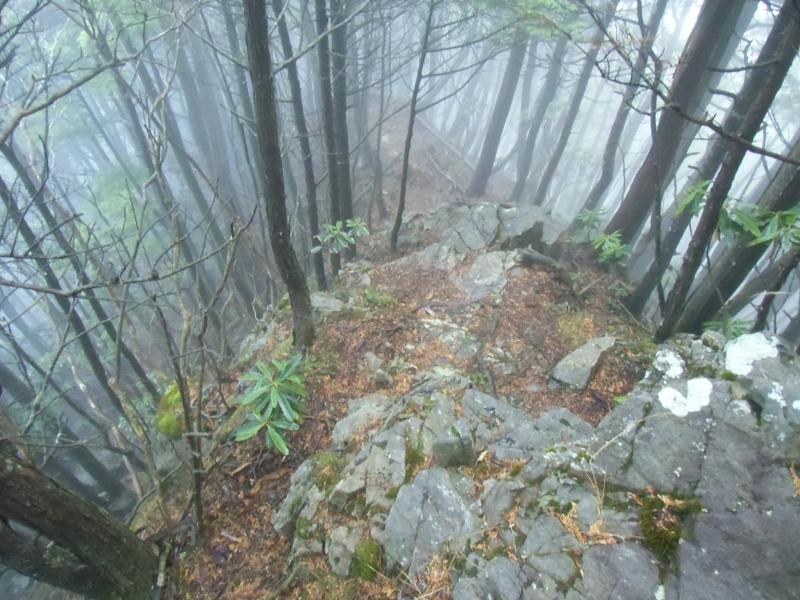 芋ノ木ドッケ~長沢山は岩・木の根が多い。これまた霧で濡れてました。たまに滑る。