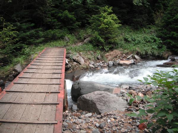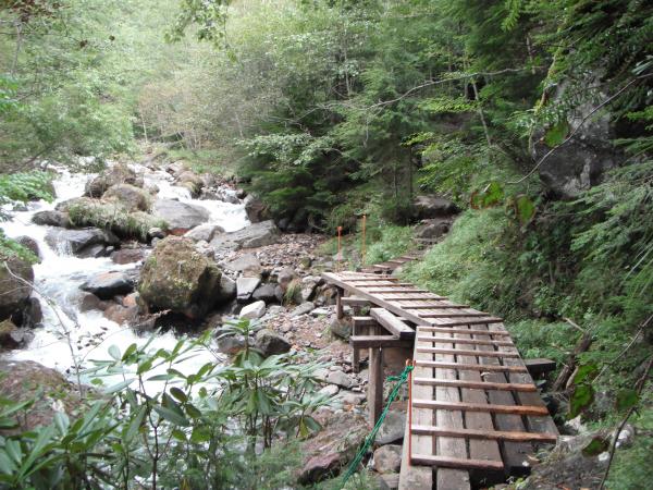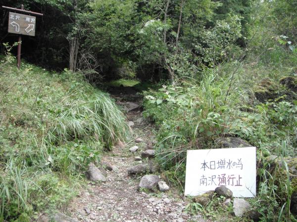 - 台風の影響で南沢が通行止めになっていました。登山道が沢のようになっていたり、ぬかるみが残っている箇所もありました。特に行者小屋のテント場は水びたしで、張れたのは10張りくらいでしょうか。なんと池まで出現していました。