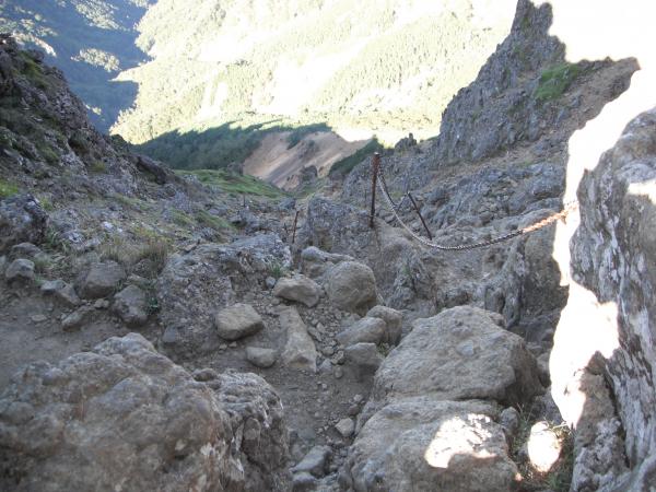 赤岳、横岳は岩場やクサリが連続します。三点確保で慎重に通過しましょう。