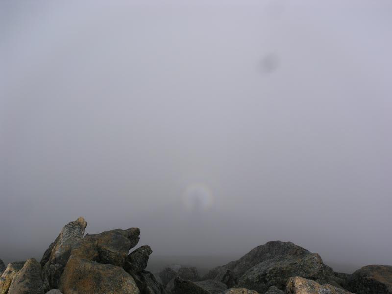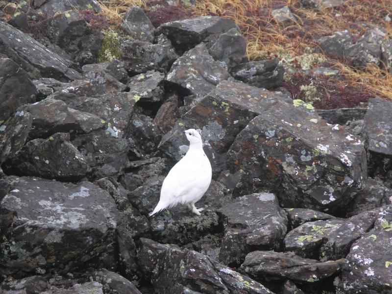その後山頂まで行きましたがガスに包まれました。途中、冬毛のライチョウさんに
