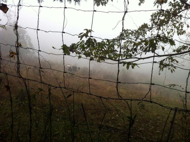 途中、視線を感じてふと顔をあげると、網の柵の霧が買った景色の中に、何かがこちらを見ています