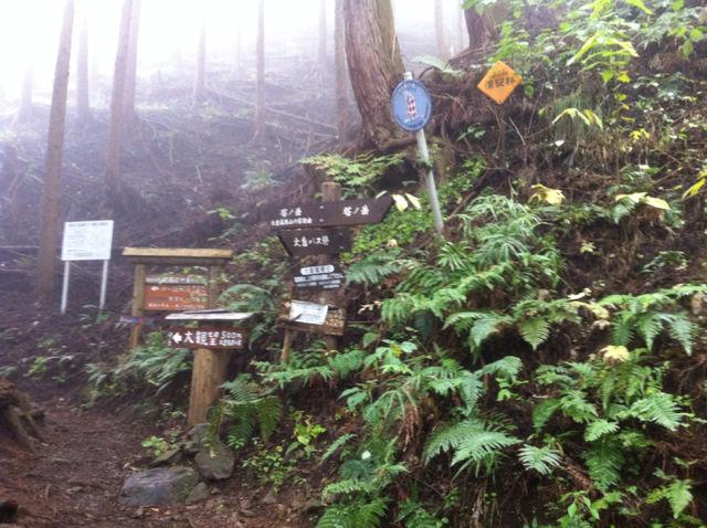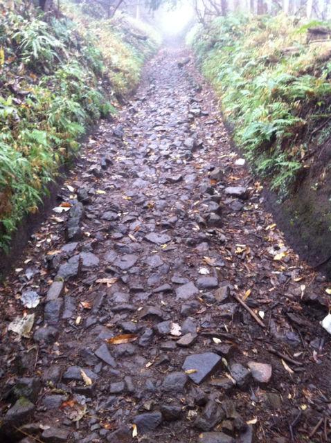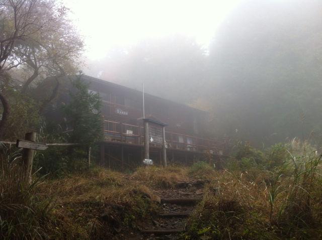 しかし、雲の中、山の中腹は登りより霧が強くて、森の中はよりうっそうとしていました。