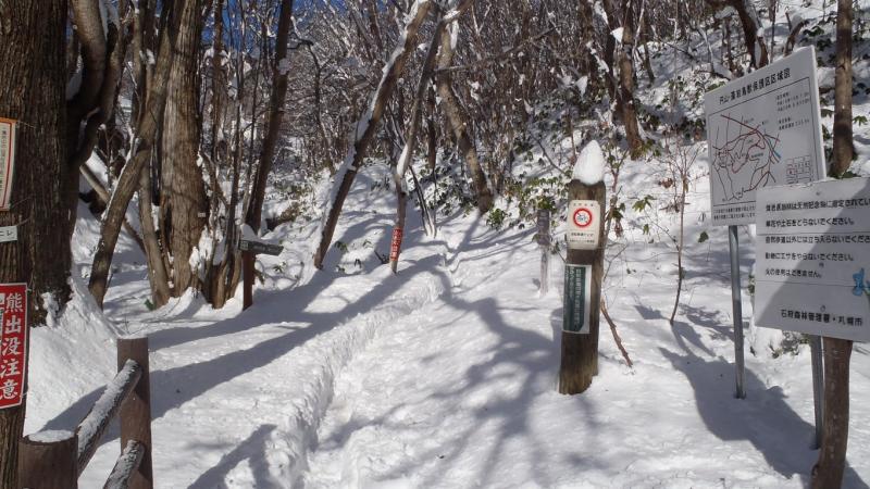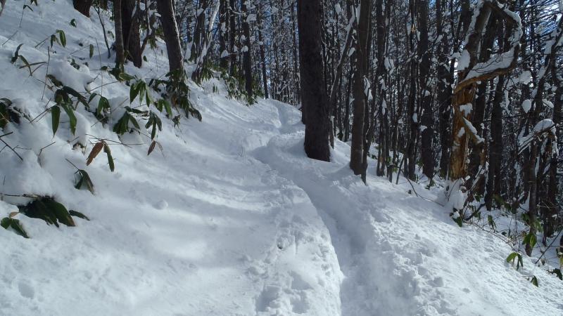 - 積雪40~50センチほど。トレースがあったのでツボ足、軽アイゼンも使用しませんでした。降雪直後以外は冬でもトレースが付いていることが多いですが、朝晩などは踏み固められて滑ることも多いので注意しましょう。
