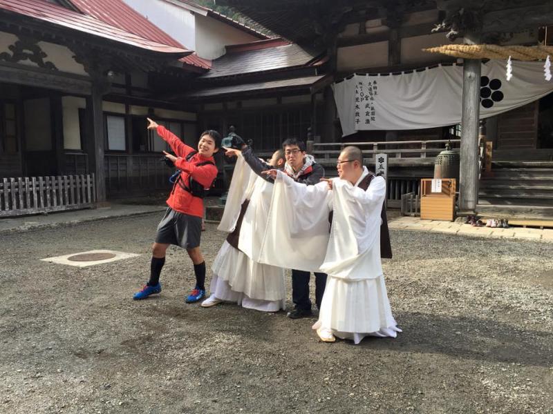 お坊さん2人が「エイドはーあっちです!」ってノリノリでやってます。