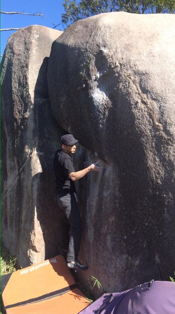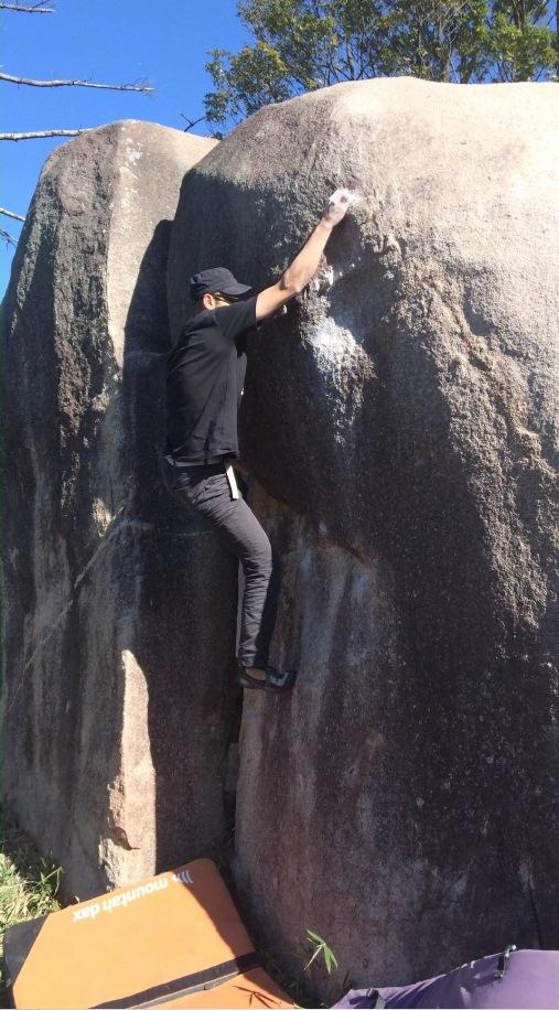 立ち込み命。手で使うホールドを選り好みしない方がいいです。最後はビンゴのやや右側に抜けます。