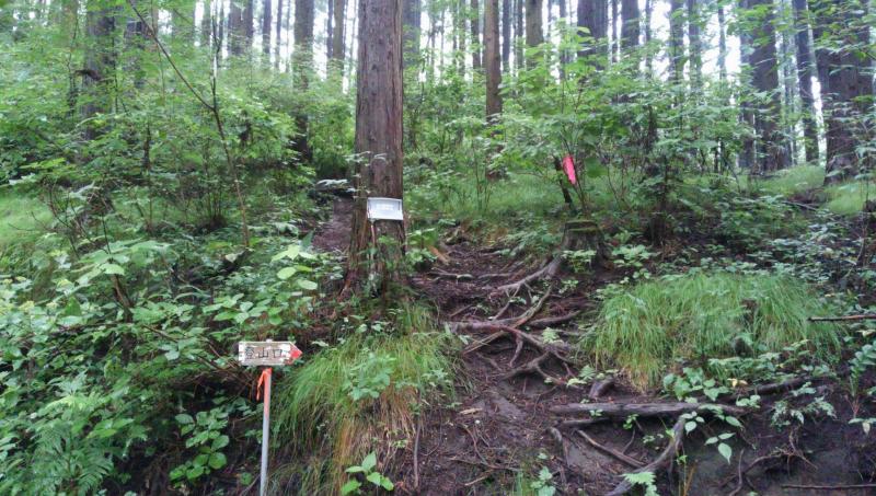 - ⓟ(8分)登山口(40分)山頂(40分)笹目倉分れ(30分)林道合流(10分)ⓟ