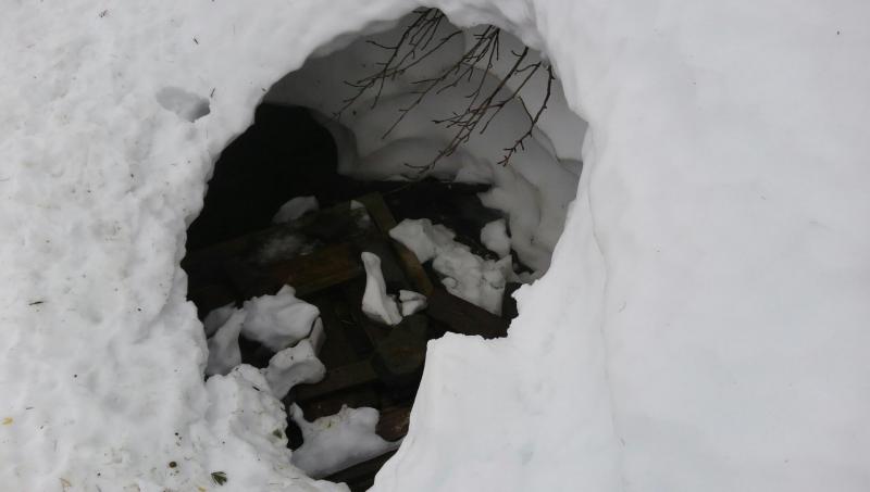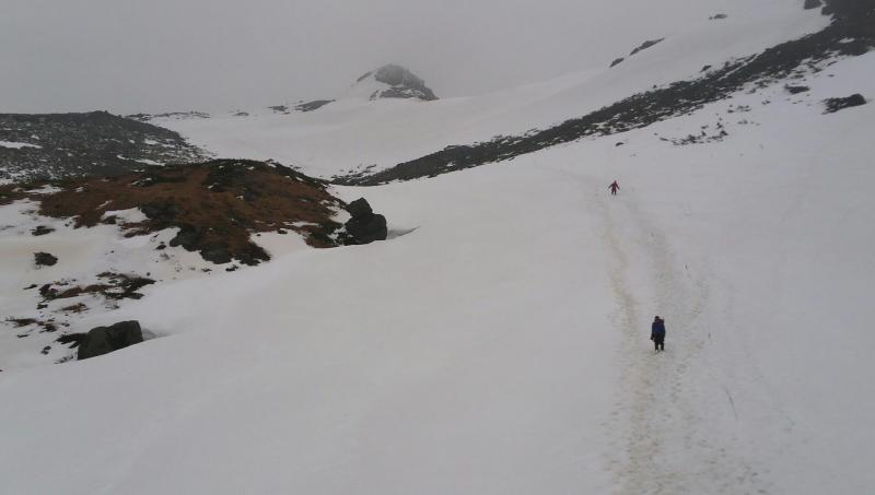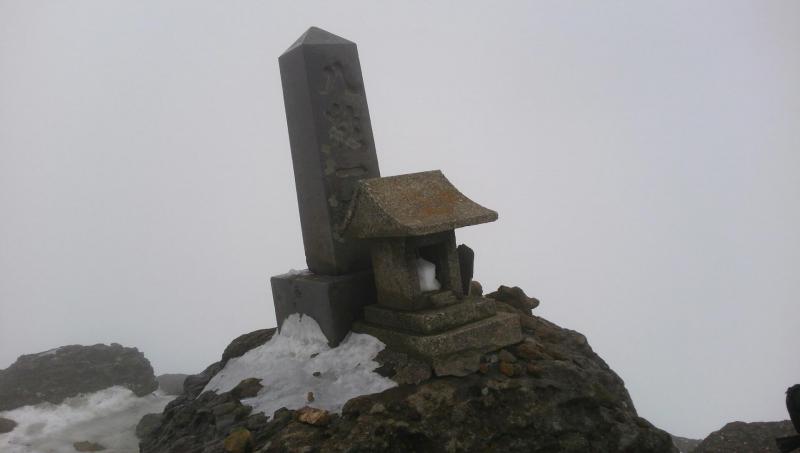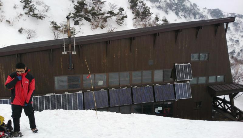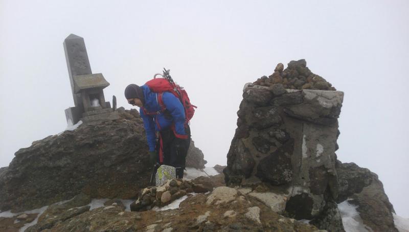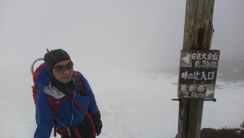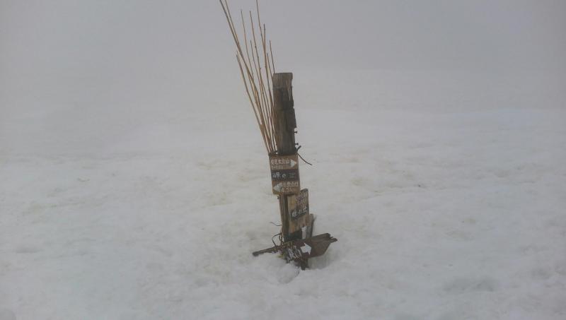 くろがね小屋でアイゼンを装着し、ストックからピッケルに変えました。