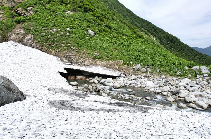 しかし、石転び沢の雪渓末端は高く薄かったので直接は取り付けず、門内沢の雪渓に登って行くにも、やはり末端が薄く心もとない。