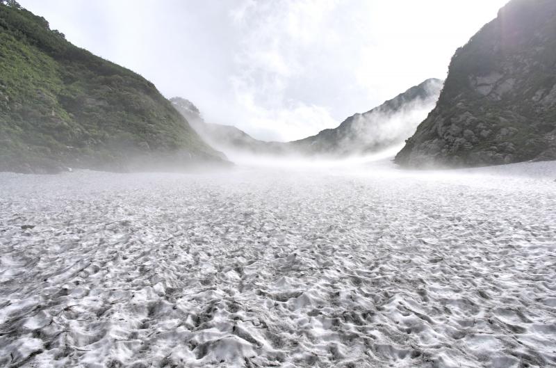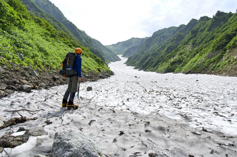 雪渓はかなり長く、休めるところもありません。落石の危険があるため、アイゼン・ピッケル・ヘルメットは必須です。また、視界が悪い時は隣の北俣沢に入らないように注意が必要です。