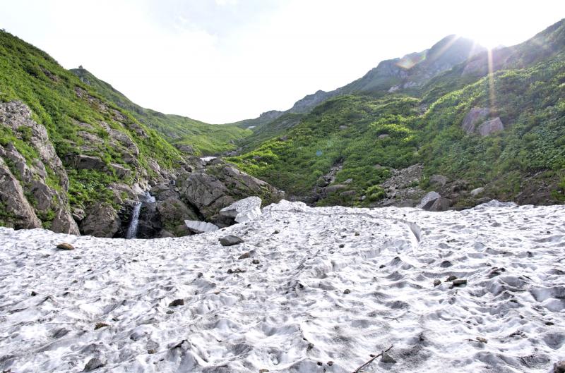 雪渓が終わり、雪解けが進まないと見れないという黒滝を横目にアイゼン・ピッケルをしまいます。