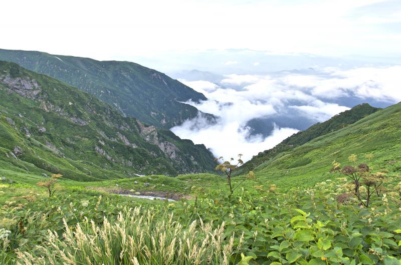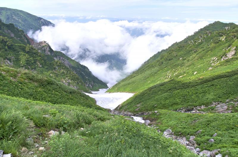 振り返ると雲が取れ、歩いて来た雪渓がどこまでも続いて行くように見え、念願の石転び沢雪渓を上がってきたんだと実感しました。