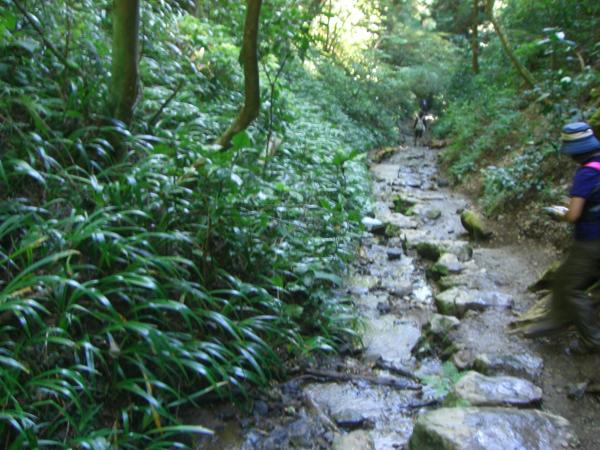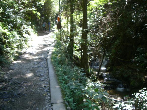 行きはケーブルカー駅横の6号路を登りました。最初は舗装されたフラットな道です。登山道に入ると沢沿いの道をずっと歩く形になります。傾斜はそれほどきつくはありません。所々、滑りやすい場所もありますが爽やかな水流を聞きながら自然を楽しめます。