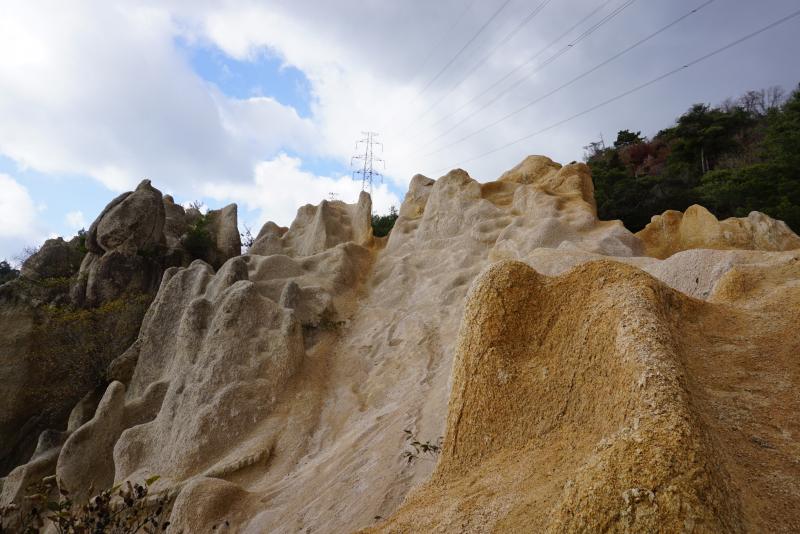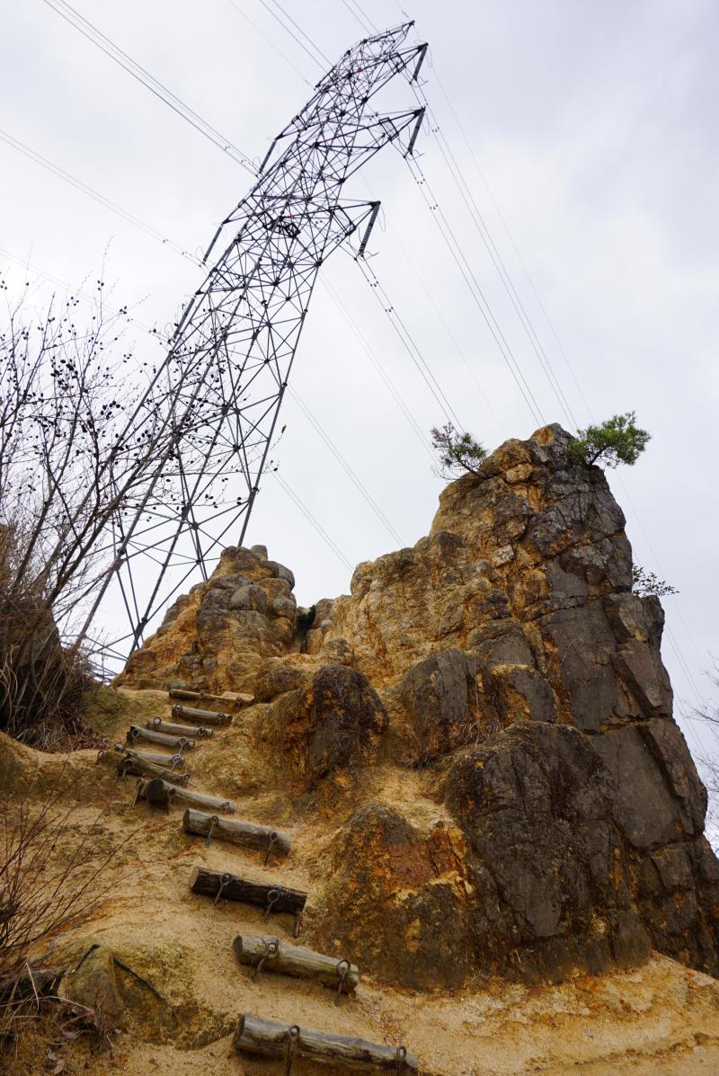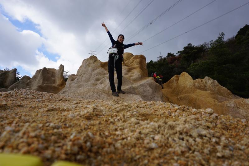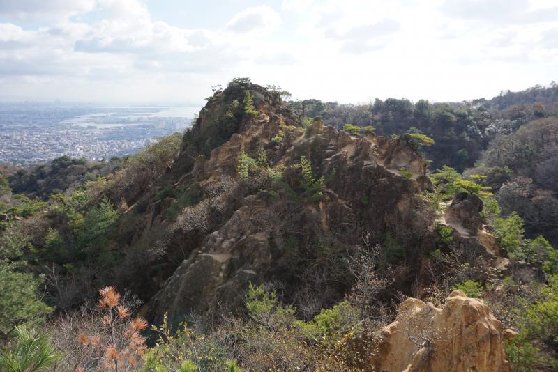 振り返ると奇怪なA懸垂岩と、奥には神戸の街並みが混じり合う何とも不思議な光景です。