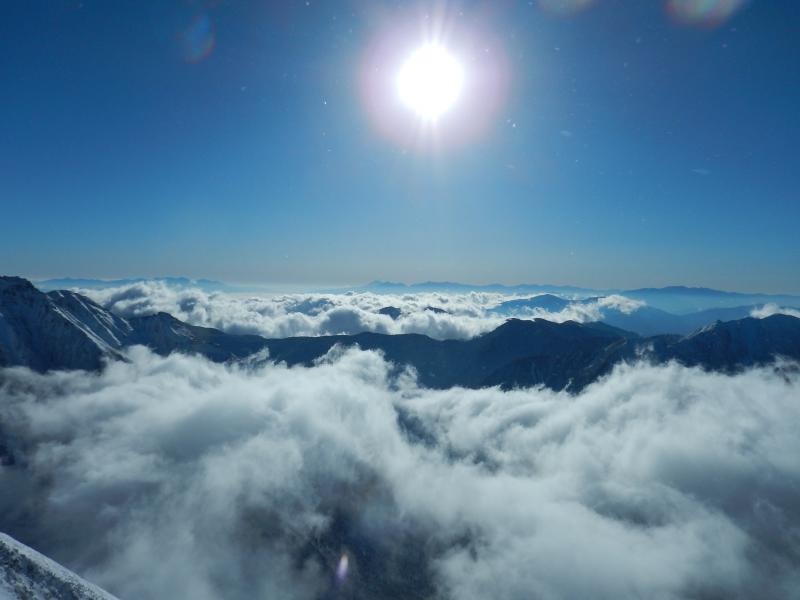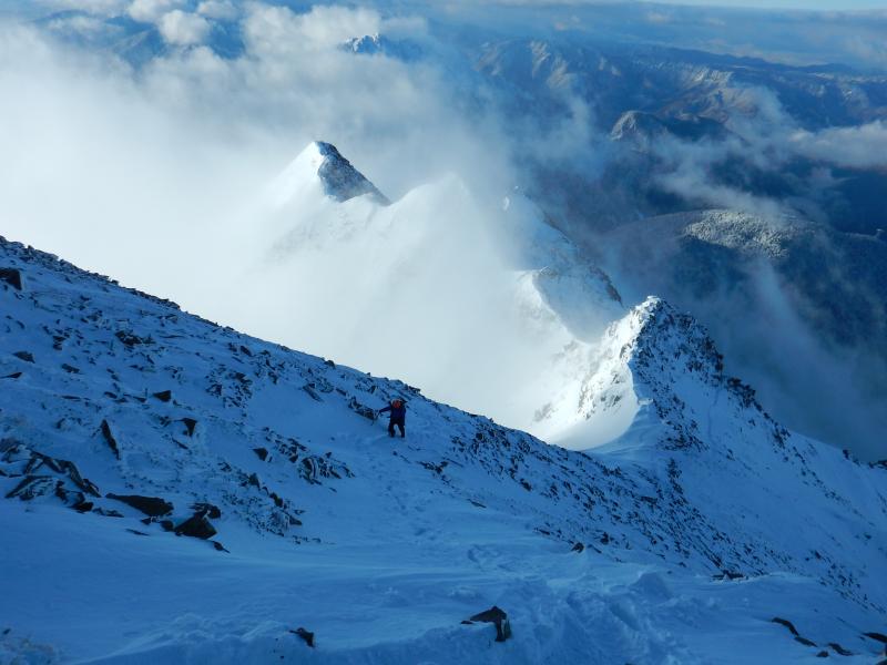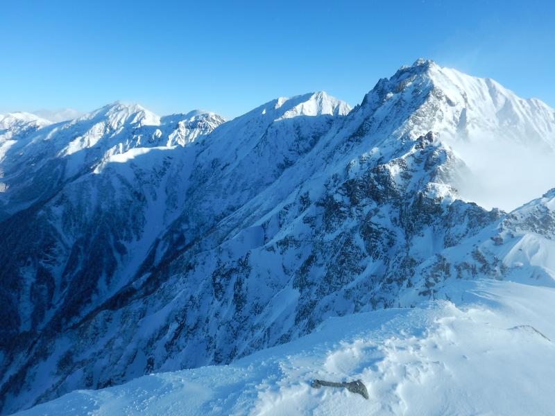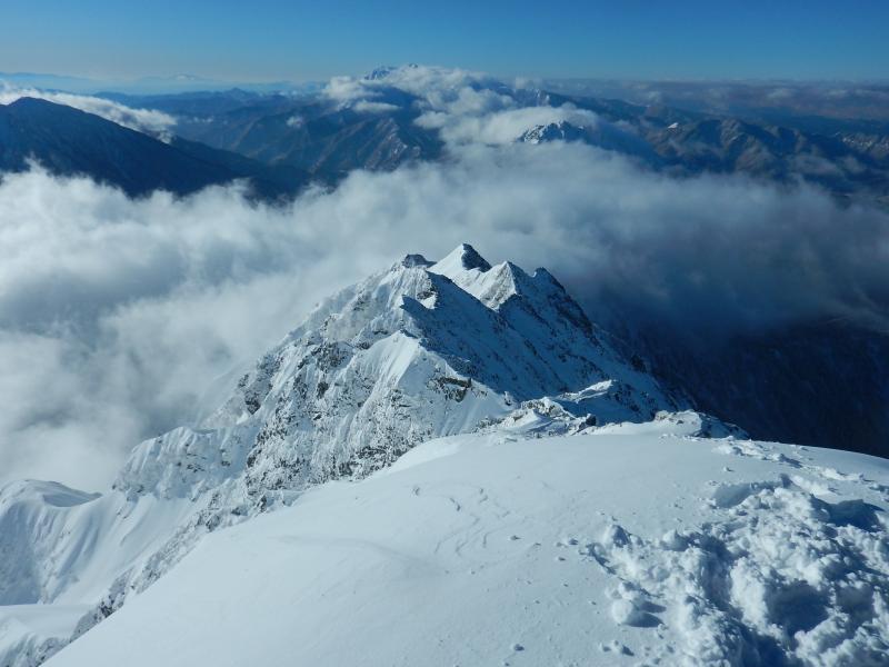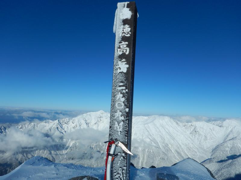 西穂山荘から丸山までは膝ラッセルあり。ワカンあったほうが楽。