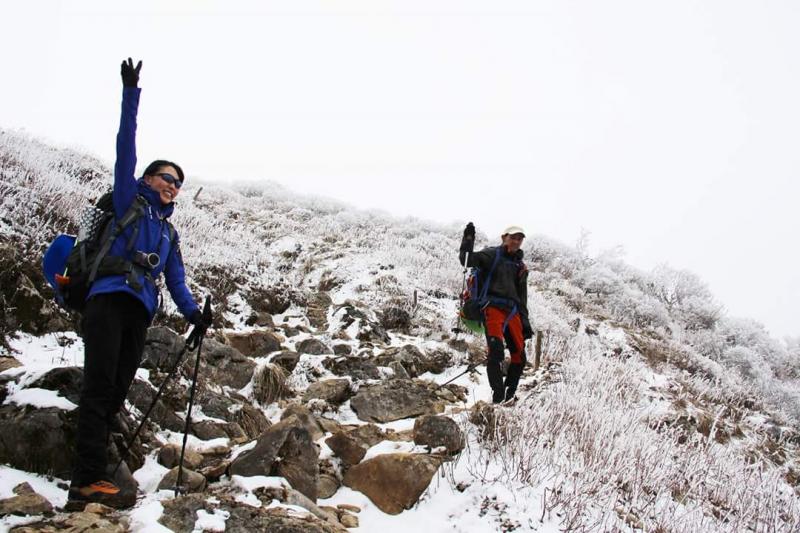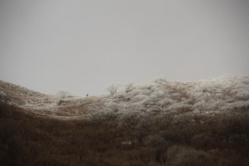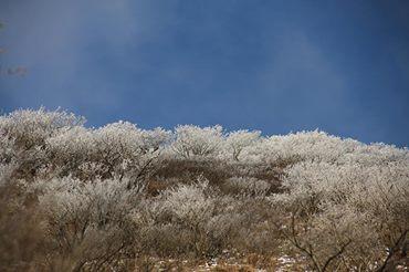 山頂付近にとてもきれいな霧氷の森が見えてきました。テンションが一気にあがります。