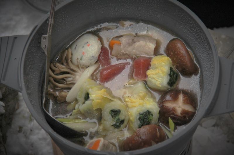 山専ボトルで作ったあったかいお鍋と飲み物で体を温めました。