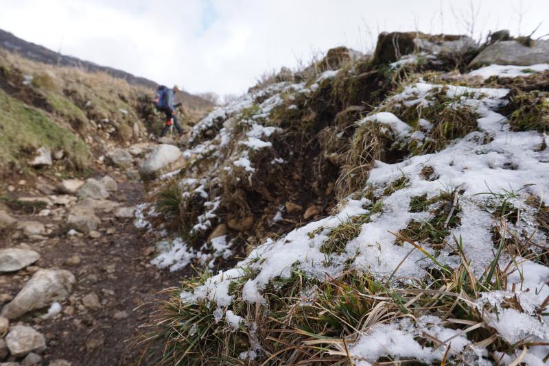 が、なかなか白いものが現れず、ようやく7~8合目辺りから雪山の体(てい)となりました。