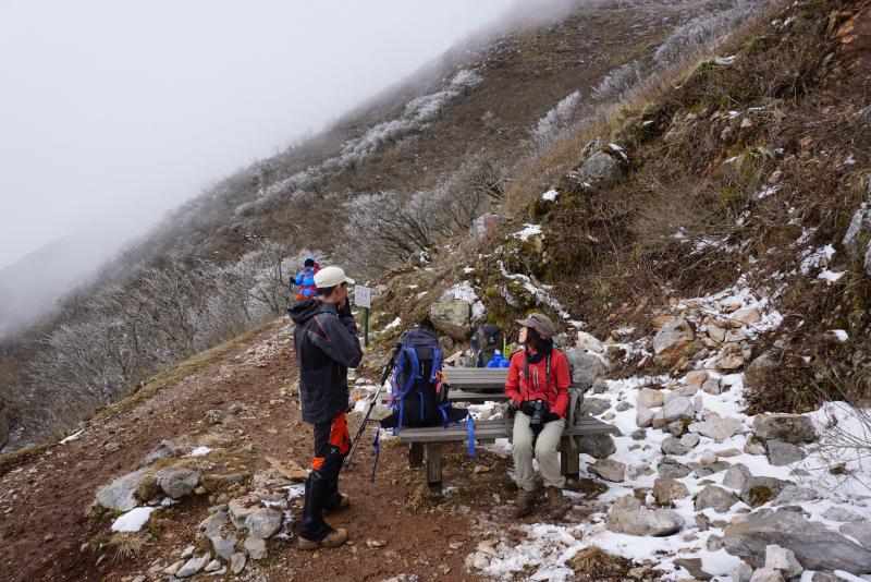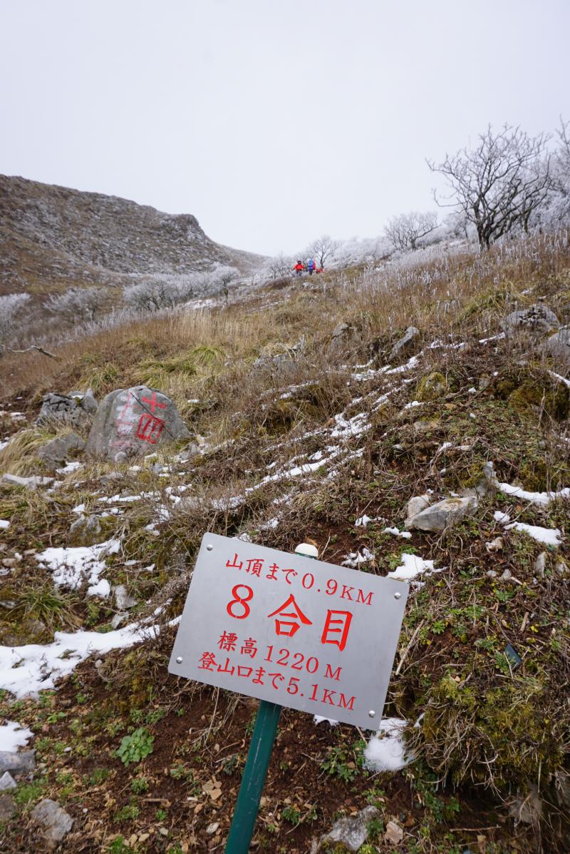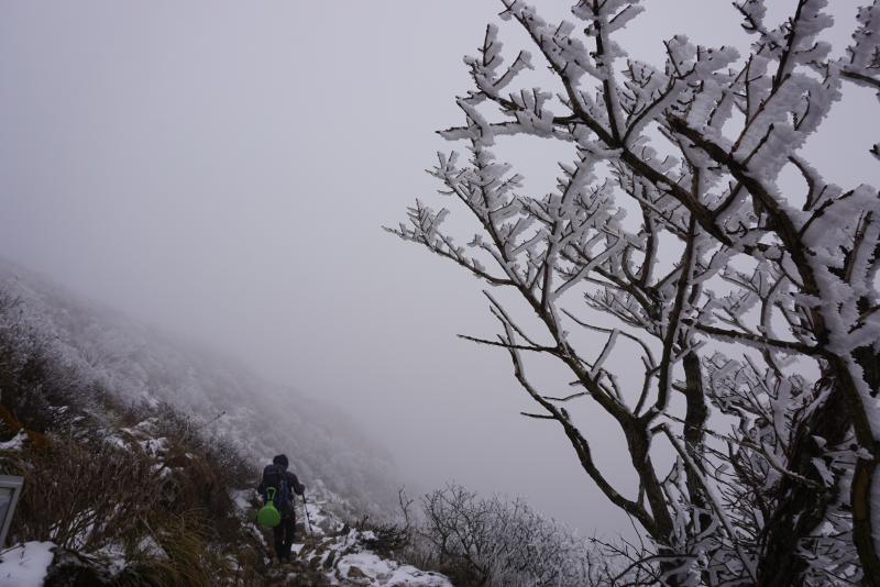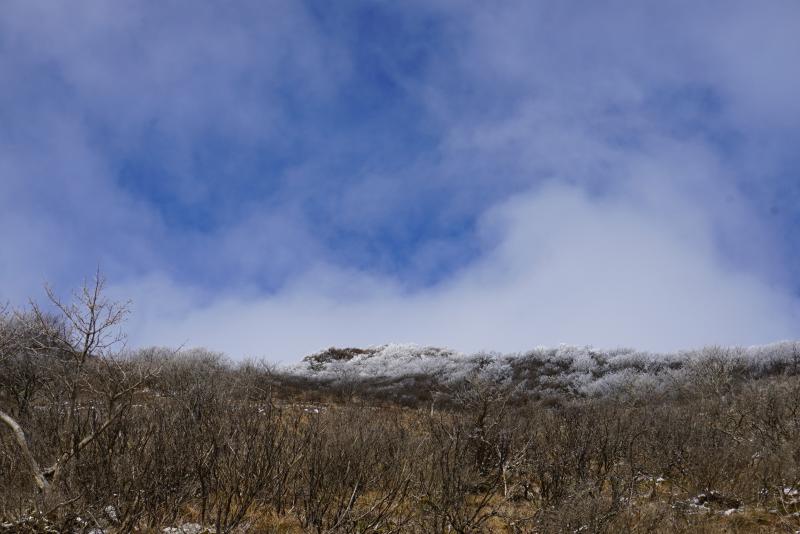 下から山頂を仰ぎ見ると、上部に霧氷のようなものが見えましたので期待しながら登っていきます。