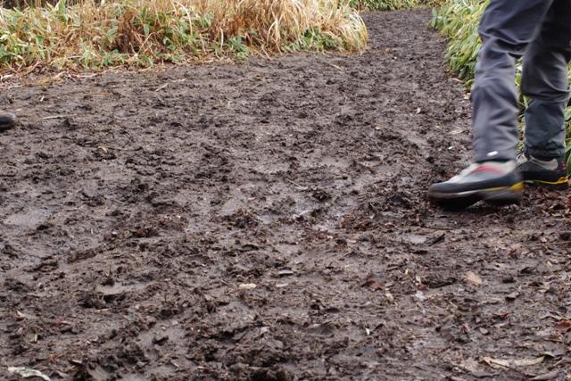 夜できた霜が解けて、登山道はぬかるみが多かったです。ゲイターを付けると汚れと足元の保温になりおすすめです。