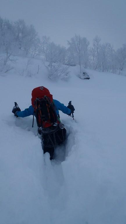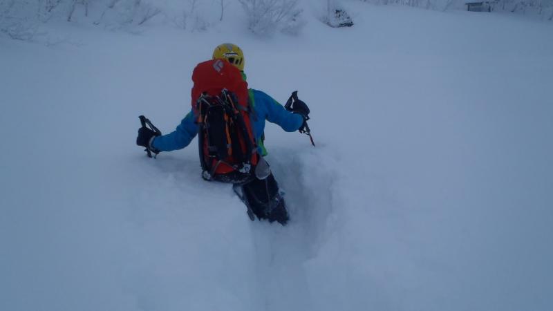すごい雪が降ったここ数日。凌雲閣からは腰ラッセルでした。今シーズン初の上ホロ、上ホロらしく厳しい条件でしたが、その中を登るからこそ意味が有ると思います。