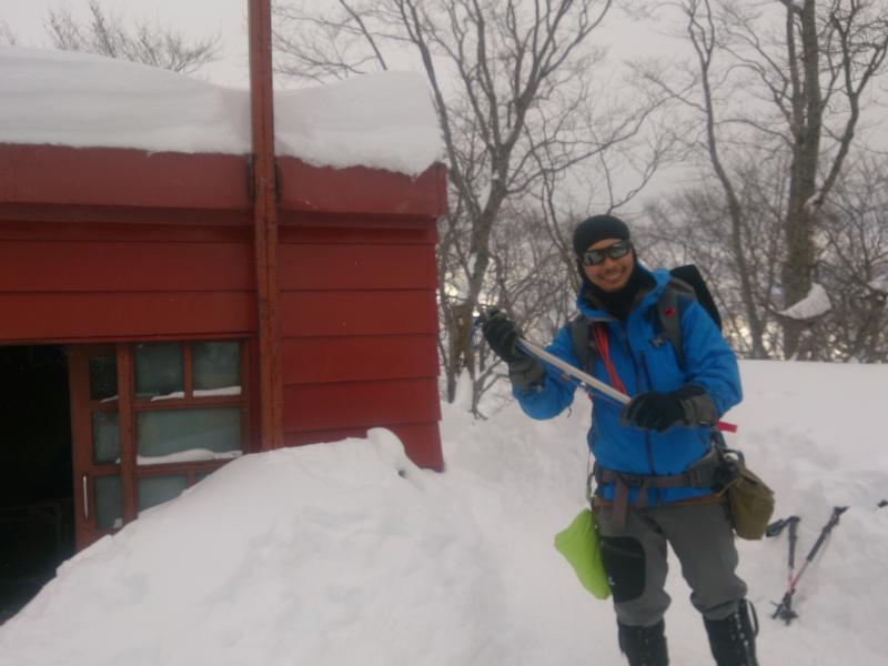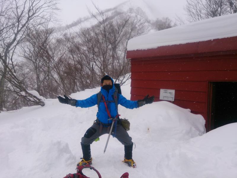 避難小屋から先もトレースがあり、歩き易かったです。1時間半ほどで肩の小屋に到着。